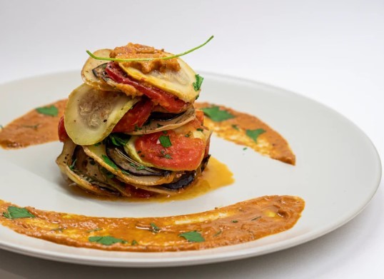 3. Untuk sayurannya: panaskan oven hingga 135 oC. Letakan irisan sayuran berselang-seling melingkari pinggan, seperti spiral, di atas piperade. Lakukan hingga pinggan penuh.